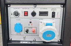 ![]() | Панель управління: інтуїтивно проста, доступна недосвідченому користувачеві. На ній виведені: кнопка запуску генератора, основні індикатори роботи (вольтметр, лічильник відпрацьованого часу (мотогодини)), розетки - 2 шт (16 А та 32 А), АВР - автоматичний регулятор напруги, запобіжник на розетки, заземлення. |