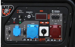 ![]() | Панель управління: інтуїтивно проста, доступна недосвідченому користувачеві. На ній виведені: кнопка запуску генератора, основні індикатори роботи, розетки 2 шт по 16 ампер та 1 шт на 32 ампера, клеми на 12В для зарядки акумуляторів, АВР - автоматичний регулятор напруги, запобіжник на розетки, заземлення. |