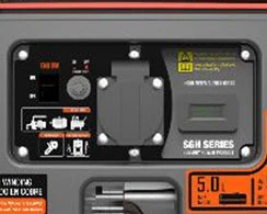 ![]() | Панель управління: інтуїтивно проста, доступна недосвідченому користувачеві. На ній виведені: кнопка запуску генератора, основні індикатори роботи, розетки 1 шт на 16 ампер, клеми на 12В для зарядки акумуляторів, запобіжник на розетки, заземлення. |