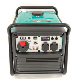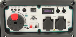 ![]() | Панель управління: інтуїтивно проста, доступна недосвідченому користувачеві. На ній виведені: кнопка запуску генератора, розетки на 16 ампер, мультиметр, запобіжник на розетки, заземлення. |