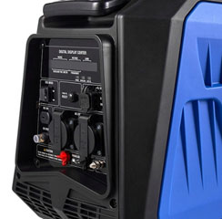![]() | Панель управління: інтуїтивно проста, доступна недосвідченому користувачеві. На ній виведені: кнопка запуску генератора, розетки - 2 шт на 16 ампер, клеми на 12В для зарядки акумуляторів, запобіжник на розетку, заземлення. |