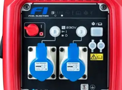 ![]() | Панель управління: інтуїтивно проста, доступна недосвідченому користувачеві. На ній виведені: кнопка запуску генератора, основні індикатори роботи, розетки - 2 шт на 16 ампер, запобіжник на розетки, заземлення. |