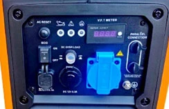 ![]() | Панель управління: інтуїтивно проста, доступна недосвідченому користувачеві. На ній виведені: кнопка запуску генератора, основні індикатори роботи, розетки - 1 шт на 16 ампер, запобіжник на розетку, заземлення. |