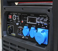 ![]() | Панель управління: інтуїтивно проста, доступна недосвідченому користувачеві. На ній виведені: кнопка запуску генератора, основні індикатори роботи, розетки - 3 шт, клеми на 12В для зарядки акумуляторiв, запобіжник на розетки, заземлення. |