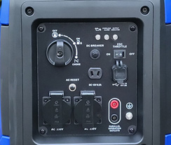![]() | Панель управління: інтуїтивно проста, доступна недосвідченому користувачеві. На ній виведені: кнопка запуску генератора, основні індикатори роботи, розетки - 2 шт на 16 ампер, клеми на 12В для зарядки акумуляторiв, запобіжник на розетки, заземлення. |