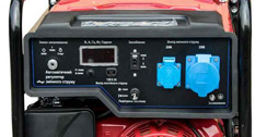![]() | Панель управління: інтуїтивно проста, доступна недосвідченому користувачеві. На ній виведені: кнопка запуску генератора, основні індикатори роботи (лiчильник вiдпрацьованого часу (мотогодини)), розетка - 1 шт на 16 ампер и 1 шт. на 32 ампера, клеми на 12В для зарядки акумуляторiв, АВР - автоматичний регулятор напруги, запобіжник на розетки, заземлення. |