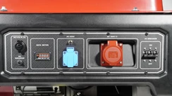 ![]() | Панель управління: інтуїтивно проста, доступна недосвідченому користувачеві. На ній виведені: кнопка запуску генератора, основні індикатори роботи (вольтметр, лічильник відпрацьованого часу (мотогодини)), розетки - 2 шт, АВР - автоматичний регулятор напруги, клеми на 12В для зарядки акумуляторів, запобіжник на розетки, заземлення. |