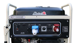 ![]() | Панель управління: інтуїтивно проста, доступна недосвідченому користувачеві. На ній виведені: кнопка запуску генератора, основні показники роботи (лічильник відпрацьованого часу (мотогодини)), розетки, клеми на 12В для зарядки акумуляторів, АВР - автоматичний регулятор напруги, запобіжник на розетки, заземлення. |