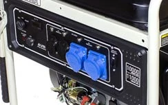 ![]() | Панель управління: інтуїтивно проста, доступна недосвідченому користувачеві. На ній виведені: кнопка запуску генератора, основні показники роботи (вольтметр, лічильник відпрацьованого часу (мотогодини)), розетки - 2 шт. на 16 Ампер та 2 шт на 32 Ампера, клеми на 12В для зарядки акумуляторів, АВР - автоматичний регулятор напруги, запобіжник на розетки, заземлення. |