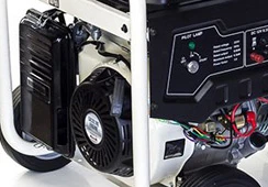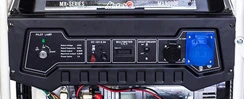 ![]() | Панель управління: Інтуїтивно проста, доступна недосвідченому користувачеві. На неї виведені кнопка запуску генератора, основні індикатори роботи (лічильник відпрацьованого часу (години)), AVR - автоматичний регулятор напруги, запобіжник на розетки, заземлення. |