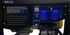 ![]() | Панель управління: інтуїтивно проста, доступна недосвідченому користувачеві. На ній виведені: кнопка запуску генератора, основні індикатори роботи (вольметр), розетки - 2 шт (32 А), АВР - автоматичний регулятор напруги, клеми на 12В для зарядки акумуляторів, запобіжник на розетки, заземлення. |