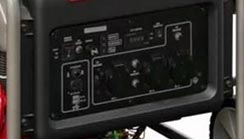 ![]() | Панель управління: інтуїтивно проста, доступна недосвідченому користувачеві. На ній виведені: кнопка запуску генератора, основні індикатори роботи, розетки 3 шт по 16 ампер, клеми на 12В для зарядки акумуляторiв, запобіжник на розетки, заземлення. |
