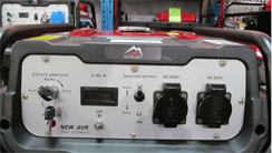 ![]() | Панель управління: інтуїтивно проста, доступна недосвідченому користувачеві. На ній виведені: кнопка запуску генератора, основні показники роботи (вольтметр, лічильник відпрацьованого часу (мотогодини)), розетки - 2 шт. по 16 ампер, клеми на 12В для зарядки акумуляторів, АВР - автоматичний регулятор напруги, запобіжник на розетки, заземлення. |