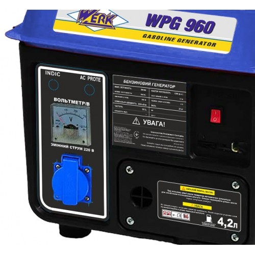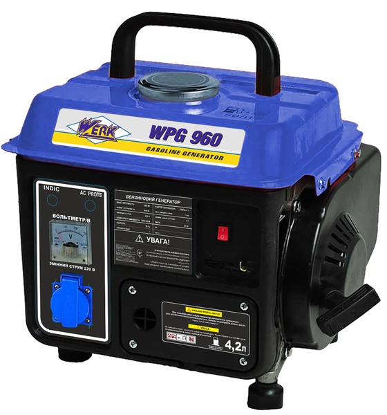 Призначення генератора Werk WPG960:Генератор Werk WPG960 може бути резервним джерелом електричного струму для забезпечення електроенергією заміського будинку, ремонтної бригади, будівництва і т.д.Генератор може забезпечити електроживлення газового котла (0,5 кВт), холодильника (0,7 кВт), пральної машини (1 кВт) і т. д.