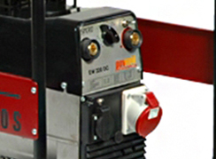 ![]() | Панель управління: інтуїтивно проста, доступна недосвідченому користувачеві. На ній виведені: розетки - 1 шт. по 16 ампер, 1 розетка на 32 Ампера, регулятор зварювального струму, клеми для підключення зварювального кабелю, запобіжник на розетки, заземлення. |