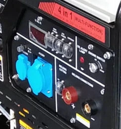 ![]() | Панель управління: інтуїтивно проста, доступна недосвідченому користувачеві. На ній виведені: кнопка запуску генератора, основні індикатори роботи, розетки - 2 шт, запобіжник на розетки, заземлення. Зварювальна розетка разом з ручкою регулювання струму, масляною лампою та клемою заземлення. |