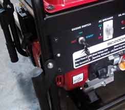 ![]() | Панель управління: інтуїтивно проста, доступна недосвідченому користувачеві. На ній виведені: кнопка запуску генератора, основні індикатори роботи, розетки - 2 шт на 16 ампер, запобіжник на розетки, заземлення. |