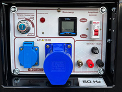 ![]() | Панель управління: інтуїтивно проста, доступна недосвідченому користувачеві. На ній виведені: кнопка запуску генератора, основні індикатори роботи (вольтметр, лічільник мотогодин), розетки 2 шт (16А та 32 А), клеми на 12В для зарядки акумуляторів, АВР - автоматичний регулятор напруги, запобіжник на розетки, заземлення. |
