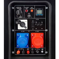 ![]() | Панель управління: інтуїтивно проста, доступна недосвідченому користувачеві. На ній виведені: кнопка запуску генератора, основнi показники роботи (мультиметр), розетки - 2 шт, клеми на 12В для зарядки акумуляторів, АВР - автоматичний регулятор напруги, запобіжник на розетки, заземлення. |