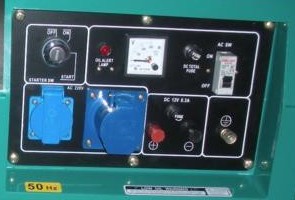 ![]() | Панель управління: інтуїтивно проста, доступна недосвідченому користувачеві. На ній виведені: кнопка запуску генератора, основні індикатори роботи (вольтметр, лiчильник вiдпрацьованого часу (мотогодини)), розетки - 2 шт на 16 ампер, клеми на 12В для зарядки акумуляторiв, АВР - автоматичний регулятор напруги, запобіжник на розетки, заземлення. |