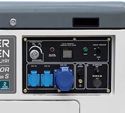 ![]() | Панель управління: інтуїтивно проста, доступна недосвідченому користувачеві. На ній виведені: кнопка запуску генератора, основнi показники роботи (вольтметр, лiчильник вiдпрацьованого часу (мотогодини)), розетки - 2 шт на 16 ампер та 1 шт на 32 ампер, клеми на 12В для зарядки акумуляторiв, АВР - автоматичний регулятор напруги, запобіжник на розетки, заземлення. |