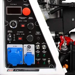 ![]() | Панель управління: інтуїтивно проста, доступна недосвідченому користувачеві. На ній виведені: кнопка запуску генератора, основні індикатори роботи, розетки 2 шт на 16 А та 32 А, запобіжник на розетки, заземлення, лічильник мотогодин, вольтметр, АВР. |