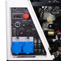 ![]() | Панель управління: інтуїтивно проста, доступна недосвідченому користувачеві. На ній виведені: кнопка запуску генератора, основні індикатори роботи, розетки 2 шт на 32 А, запобіжник на розетки, заземлення, лічильник мотогодин, вольтметр. |