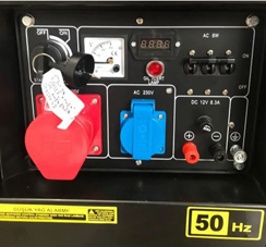 ![]() | Панель управління: інтуїтивно проста, доступна недосвідченому користувачеві. На ній виведені: кнопка запуску генератора, основні індикатори роботи (вольтметр, лічільник мотогодин), розетки 2 шт, клеми на 12В для зарядки акумуляторів, запобіжник на розетки, заземлення. |