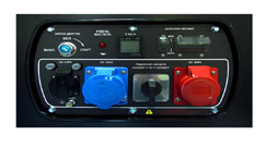 ![]() | Панель управління: інтуїтивно проста, доступна недосвідченому користувачеві. На ній виведені: кнопка запуску генератора, основні індикатори роботи (лічильник відпрацьованого часу (мотогодини)), розетки - 3 шт., запобіжник на розетки, заземлення. |