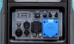 ![]() | Панель управління: інтуїтивно проста, доступна недосвідченому користувачеві. На ній виведені: кнопка запуску генератора, розетки - 2 шт на 16 А та 32 А, клеми на 12В для зарядки акумуляторів, запобіжник на розетки, заземлення. |
