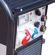 ![]() | Панель управління: інтуїтивно проста, доступна недосвідченому користувачеві. На ній виведені: кнопка запуску генератора, основні показники роботи (вольтметр, лічильник відпрацьованого часу (мотогодини)), розетки - 2 шт. на 16 ампер, запобіжник на розетки, заземлення. |