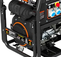 - Довгий ресурс компонентів: генератор зібраний на спеціалізованому заводі з дотриманням світових стандартів якості. Рама має антикорозійне покриття. Довговічність силового агрегату забезпечує система повітряного охолодження.