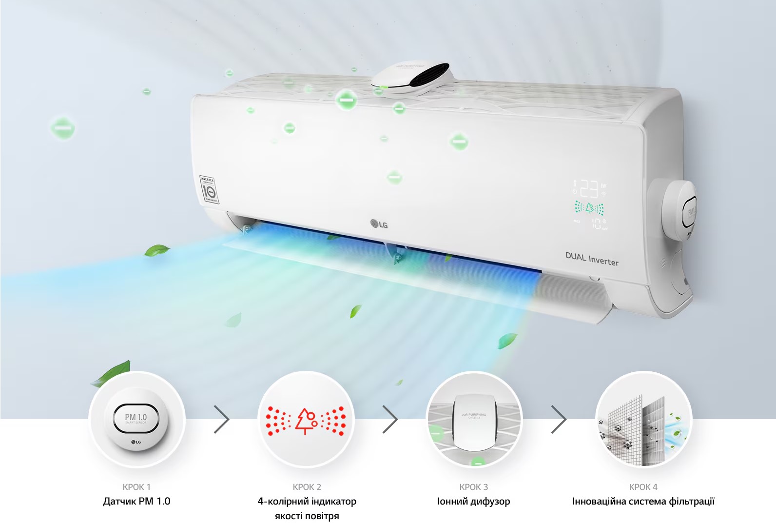 Кондиціонер забезпечує швидке та потужне охолодження або нагрівання за допомогою компресора LG DUAL Inverter Compressor. Технологія подвійного інверторного компресора LG покращує продуктивність, дозволяючи кондиціонеру охолоджуватися швидше, працювати довше та забезпечувати тихішу роботу. Інверторний компресор постійно регулює свою швидкість, щоб постійно підтримувати бажану температуру. Завдяки 10-річній гарантії на компресор ви можете користуватися своїм кондиціонером у повному спокої.