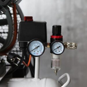 Наявність манометра і регулятора тиску – служать для точного регулювання і контролю за повітряним тиском в системі повітряного компресора на виході. Виробником передбачено наявність двох манометрів для контролю за повітряним тиском в баку ресивера і вихідного тиску. При роботі ремінного повітряного нагнітача з різними інструментами виникає необхідність в зміні тиску повітряної системи що легко зробити за допомогою регулятора.