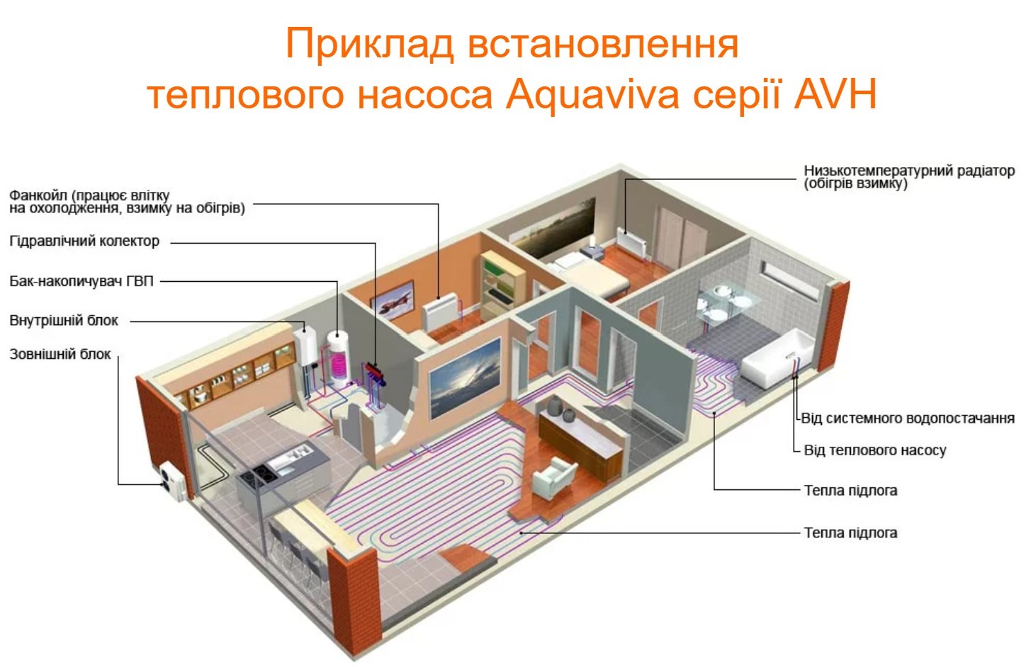 Теплові насоси Aquaviva серії AVH мають збільшену потужність роботи. Це дозволяє встановити декілька фанкойлів в різних кімнатах будинку, використовуючи лише один зовнішній блок. Така система вентиляції дозволяє заощадити кошти на додатковому обладнанні й зберегти естетичний вигляд вашого будинку. Також в зимовий час фанкойли можуть використовуватися замість батарей для обігріву приміщення.