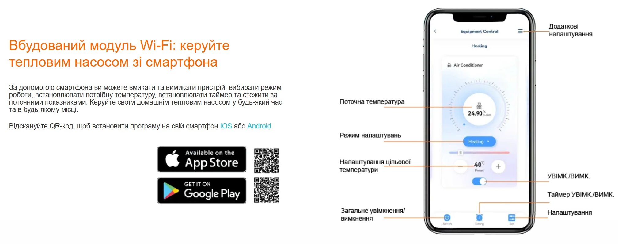 - Загальне увімкнення/вимкнення теплового насосу, режими, розблокування/блокування екрану;