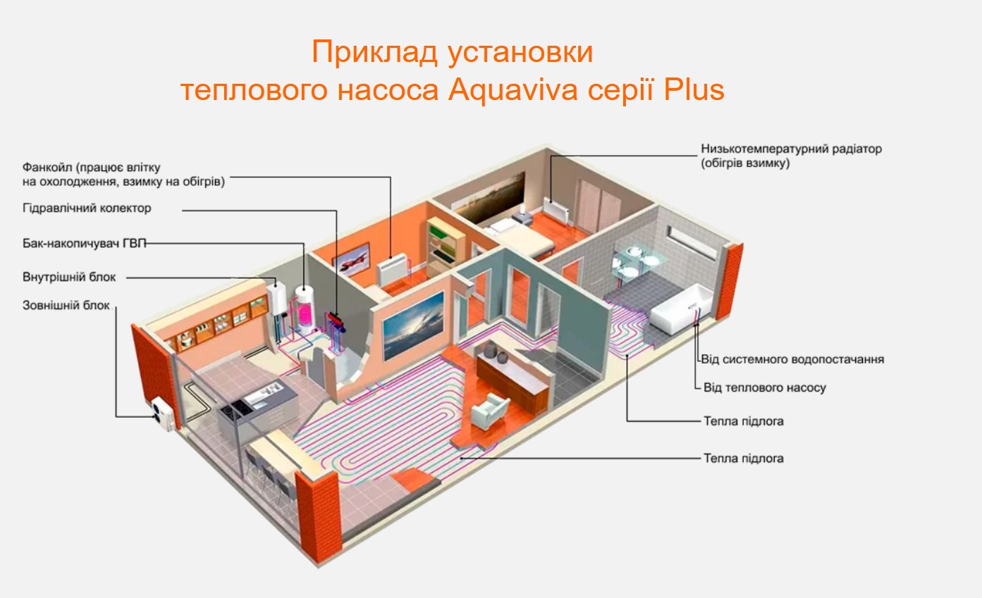 - Aquaviva Plus — це універсальні системи, які можуть використовуватися для опалення приміщень, охолодження і кондиціонування влітку та нагрівання гарячої води.
