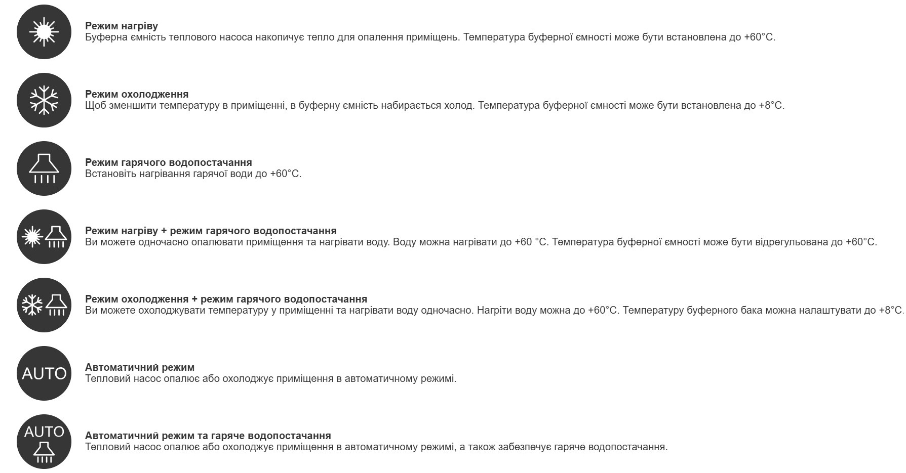 - Загальне увімкнення/вимкнення теплового насосу, режими, розблокування/блокування екрану;