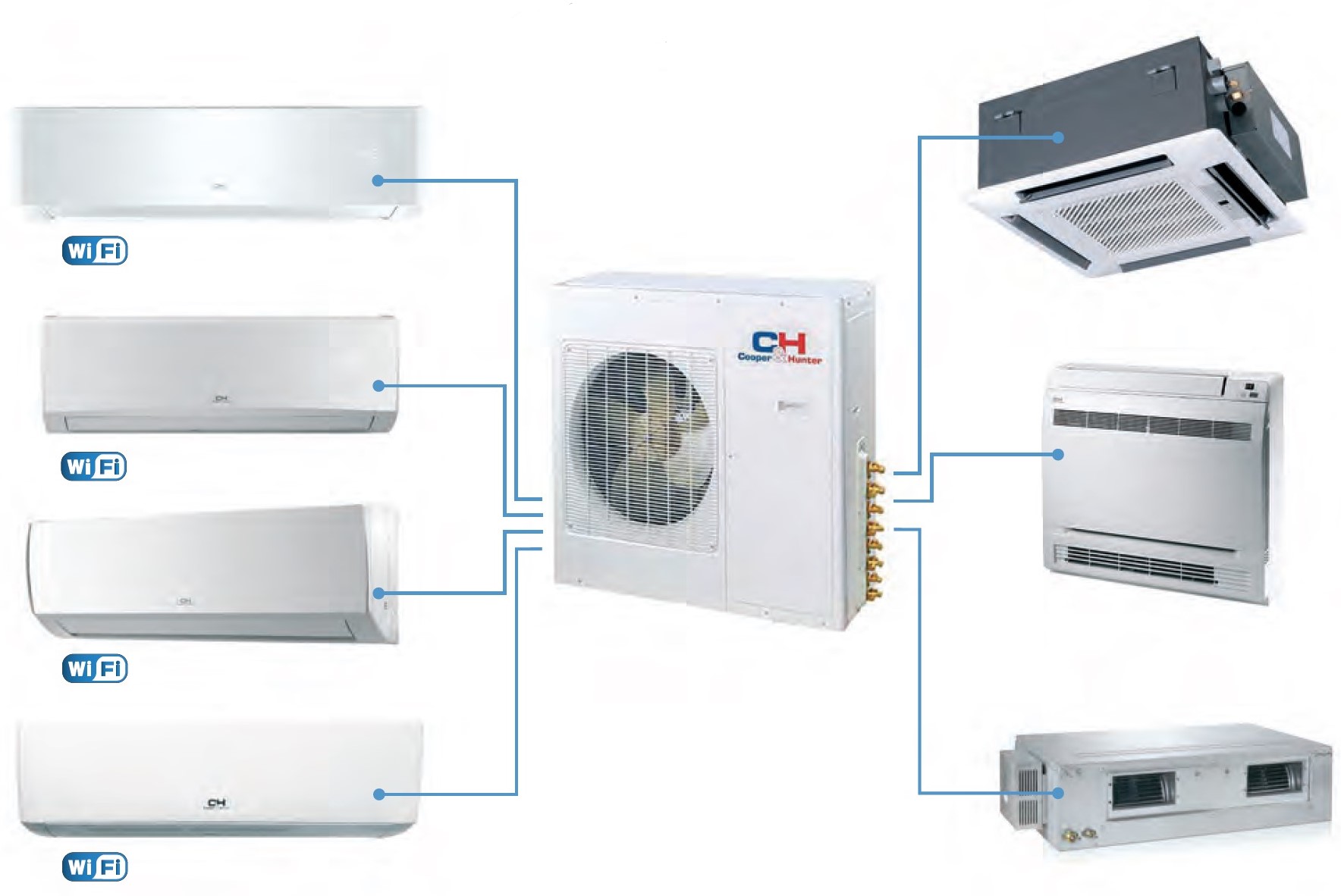 Вибирайте тип внутрішнього блоку та налаштовуйте свою систему на свій смак. Один зовнішній блок — це все, що потрібно для підключення різних типів внутрішніх блоків. Виберіть естетичний дизайн, який найкраще відповідає простору. Лінійка внутрішніх блоків Cooper&Hunter різного конструктивного виконання включає в себе: настінні, касетні, канальні та консольні блоки.